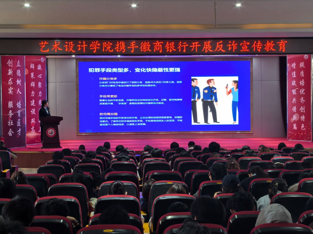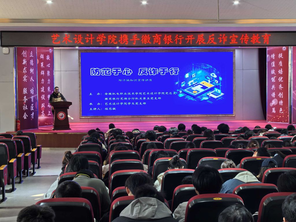 为切实筑牢校园反诈安全防线,提升学生风险防范意识与识骗防骗能力,11月12日,艺术设计学院联合徽商银行芜湖中山南路支行,共同举办“防范于心,反诈于行”反诈宣讲活动。学院党总支副书记王冬冬、全体2025级新生及2023级、2024级学生代表参加活动,学院学生党支部书记章建业主持。