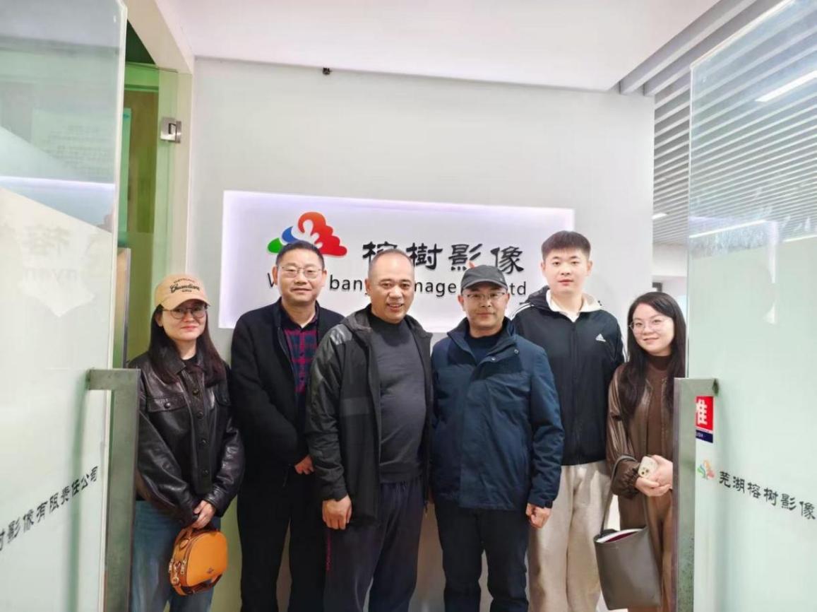 在芜湖榕树影像有限责任公司,学院一行参观了公司的摄影棚、后期制作中心等核心工作区域,企业总经理阮总详细介绍了公司在商业短视频制作及视觉艺术创作等领域的前沿技术和业务模式。双方就数字媒体技术、广告艺术设计等专业学生的岗位实习、社会服务及横向课题进行了深入交流。