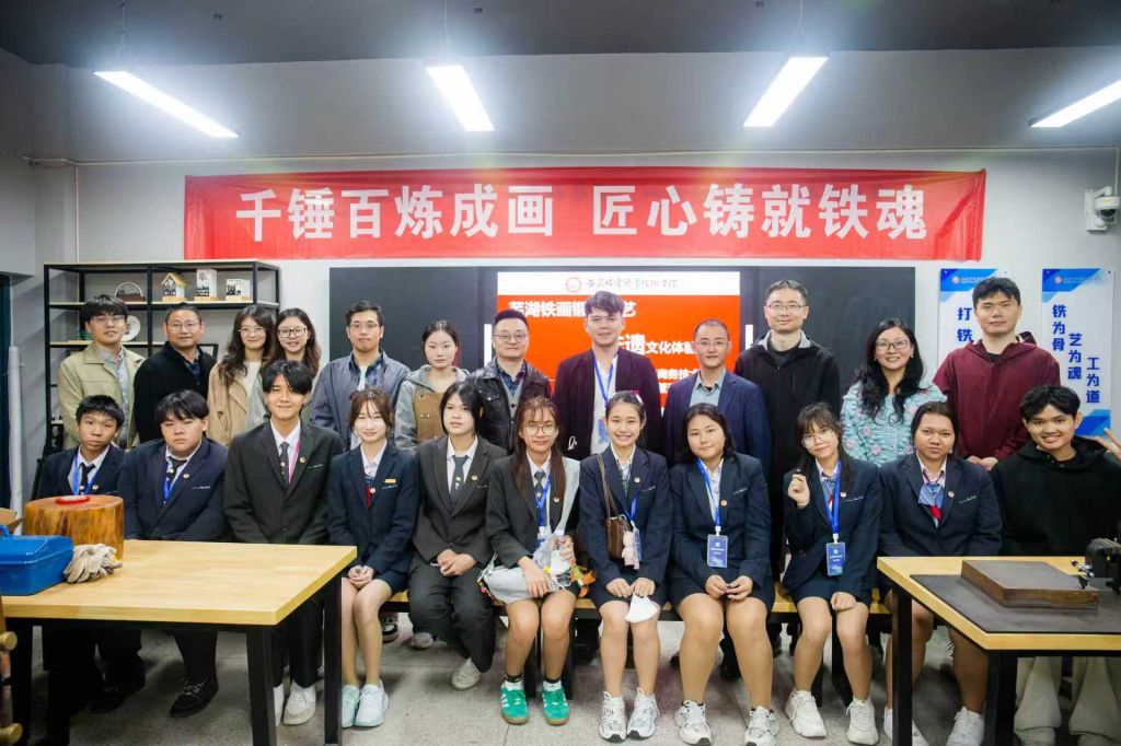 本次活动是我校落实“整合社会美育资源”“共享公共美育资源”等政策精神的具体实践。泰国师生在铁画基地近距离感受了“以铁为墨、以锤为笔”的匠心技艺,深入了解芜湖铁画三百年的艺术脉络与文化内涵。在铁画锻制工坊中,泰国学生在专业教师指导下亲手体验握锤、锻打等基础工序,在实践互动中领会中国传统工艺的精神内核,现场气氛热烈融洽。