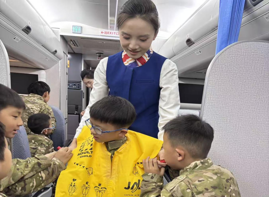 模拟舱实景体验:在空乘实训基地的全尺寸模拟机舱内,孩子们化身“小小乘客”,沉浸式学习乘机流程,亲手操作机舱内的灯光、通风等按钮及指示灯;在指导下练习安全带的正确系法与解开步骤,学习氧气面罩、救生衣的规范使用方法。