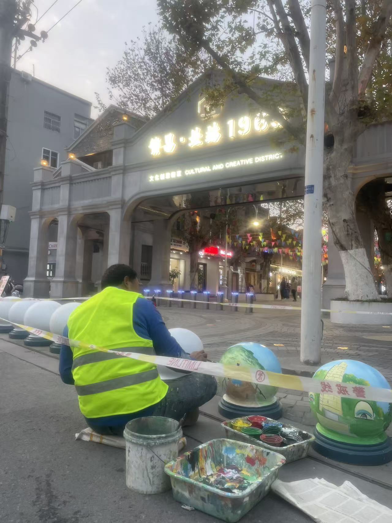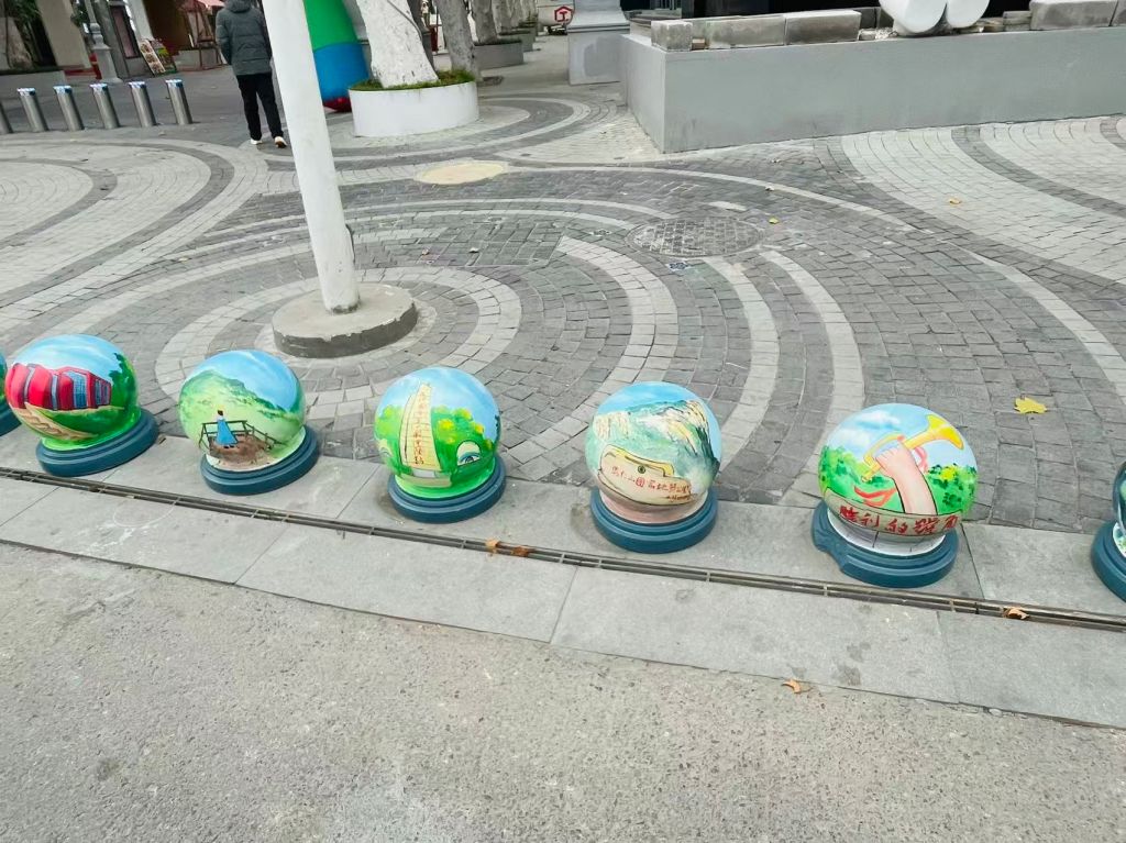 本次彩绘项目规模达90个路障球,围绕“繁昌地域文化”“二十四节气”“北站铁路记忆”“1969工业精神”“学院特色文化”及“互动打卡”六大主题展开创作。在教师指导下,学生团队将课堂所学的色彩构成、图形设计与空间美学知识运用于实地创作,以几何抽象与具象符号相结合的艺术风格,将原本功能单一的路障球转化为承载地方历史、传播美学理念的公共艺术装置。彩绘过程严格遵循清洁、打底、绘制、保护等专业流程,确保了作品的户外耐久性与艺术表现力。
