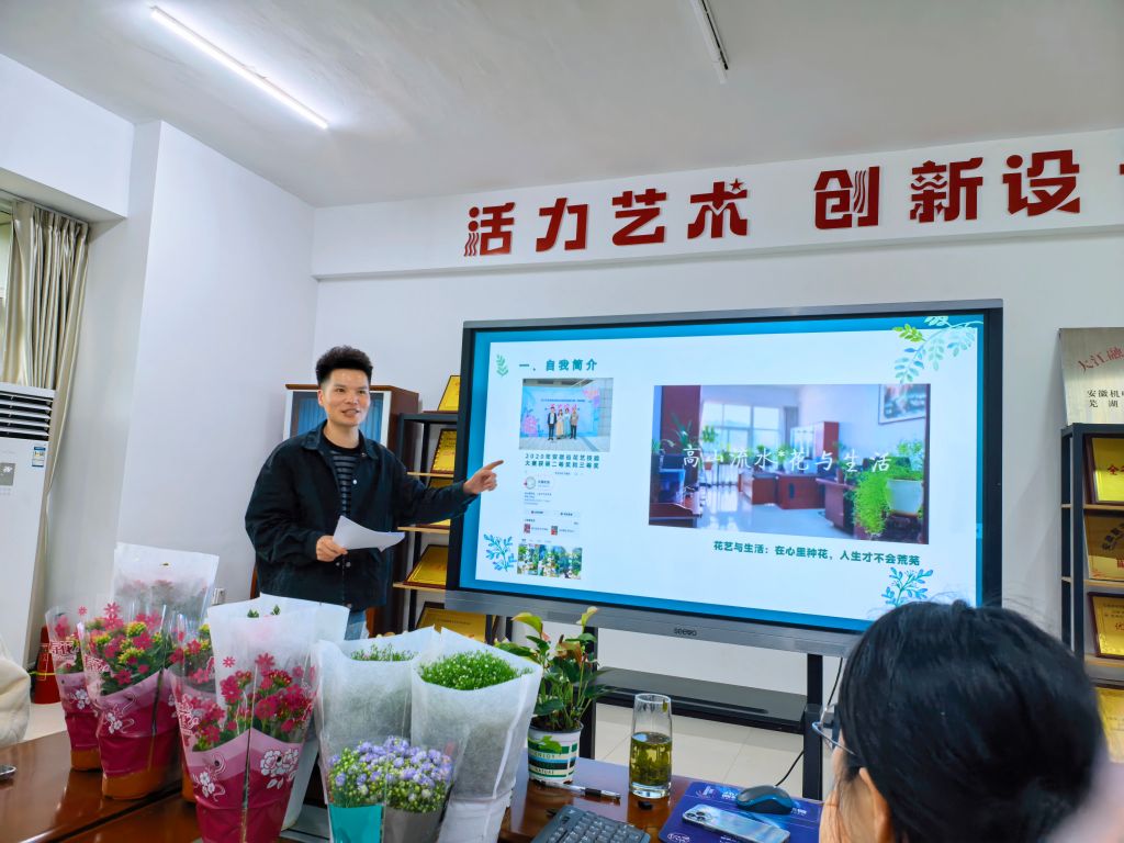 活动以简短园艺理论+实践操作+心理引导为核心模式,时长约 30分钟,兼具专业性、实用性与趣味性。培训环节围绕园艺疗愈原理、职场压力调节、简易绿植养护等内容展开讲解,结合艺术设计专业特色,指导教职工完成小型绿植盆栽制作,在动手实践中放松身心、涵养心灵。穿插进行的有奖竞答气氛热烈,题目聚焦园艺养护技巧与心理调适知识,老师们踊跃抢答,在互动中巩固知识、收获乐趣。